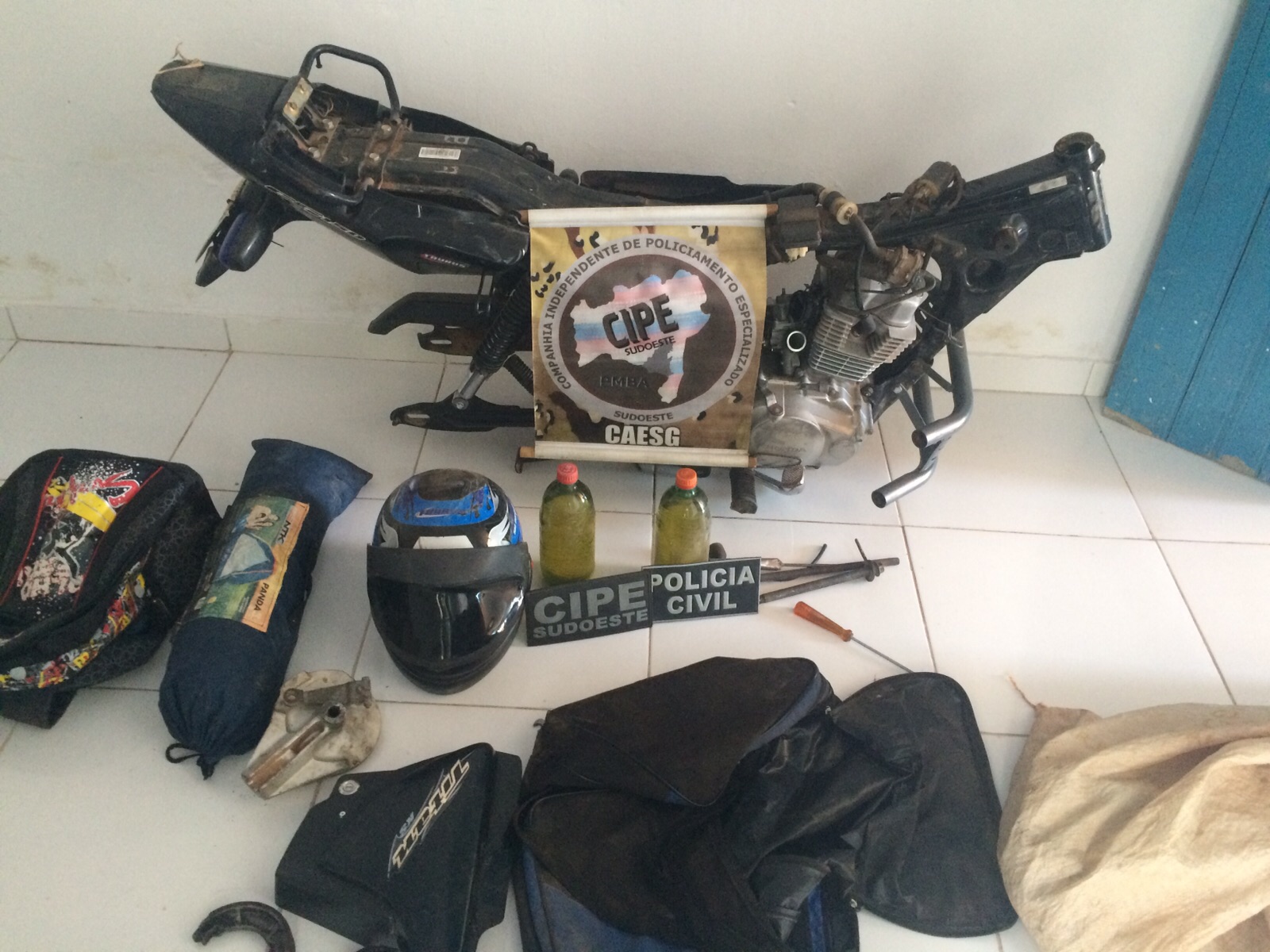Operação conjunta da polícia Cipe Sudoeste e Civil sob o comando do IPC Ramos, realizada no Bairro Casas Populares, Distrito de Cascavel município de Ibicoara, objetivando localizar quadrilha com 06 (seis) integrantes chefiados pelo indivíduo conhecido vulgarmente por LANDO, este que vem realizando diversas ações criminosas na região. Ao avistaram as viaturas os indivíduos empreenderam fuga, abandonando uma motocicleta roubada Honda CG Titan de cor preta placa policial DOF 5608 licença de Itaira SP, além de diversos objetos suspeitos. Salientando que LANDO é um indivíduo perigoso e foragido da Polícia, com mandando de prisão expedido pela justiça de Barra da EstivaBA. (Fotos: Divulgação – Polícia Civil).