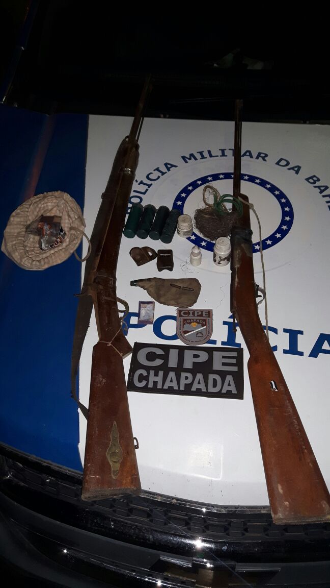 Na ultima quinta-feira (26), por volta das 5h20min, a guarnição Eco, juntamente com uma guarnição da Cippa Lençóis, saiu em diligência para povoado de Colônia – Itaetê/Ba, para cumprimento de mandado de  prisão em desfavor de  Adenilson Barbosa Nascimento. Ao chegar no local foi lhe dado voz de prisão e durante busca feita em sua residência foram onde encontradas 2 (duas) espingardas de fabricação artesanal, 2 (dois) cartuchos intactos calibre 22,  munição para as espingardas e uma pequena quantidade de semente de maconha. O indivíduo foi conduzido e apresentado à autoridade competente, na cidade de Itaberaba/Ba. (Foto: Divulgação Polícia Militar).