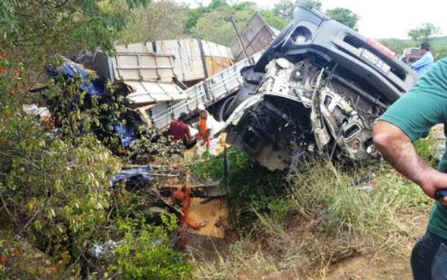 Três pessoas morreram na madrugada desta quinta-feira (8) após um acidente na BR-242, na altura da cidade de Seabra, região da Chapada Diamantina. De acordo com a Polícia Rodoviária Federal (PRF), um caminhão, carregado de cebola, e uma carreta bitrem que transportava soja, bateram de frente. Segundo o G1, não há detalhes das causas do acidente, mas a PRF informou que os veículos ficaram destruídos. Conforme a polícia, o impacto da batida foi tão grande que os veículos foram jogados para um matagal próximo ao acostamento da rodovia e as vítimas morreram no local. A bateria de um dos veículos se soltou, a cabine do caminhão ficou totalmente amassada e a carreta bitrem capotou após a colisão. Duas das vítimas estavam no caminhão. No bitrem, seguia apenas o motorista, segundo a PRF. (Foto: Guilherme Maciel/Blog do Braga).