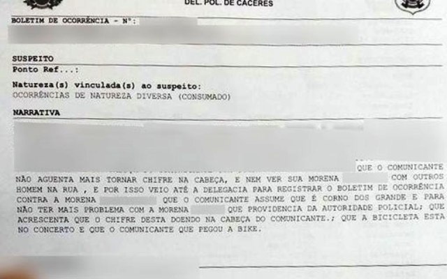 Um caso inusitado aconteceu na cidade de Cáceres, no Mato Grosso. De acordo com informações do G1, um homem procurou a delegacia de Polícia Civil para registrar uma ocorrência contra a esposa. O caso é que ele alega estar cansado de ser traído por ela. No documento, registrado na última segunda-feira (17), o homem, de 50 anos, disse que não aguentava mais ‘tomar chifre’, por isso resolveu procurar a polícia. Ele relatou  que tem um relacionamento com uma mulher que conheceu em Cáceres, porém, teria presenciado diversas traições, sendo que em uma delas encontrou a companheira na cama com outro homem. Ele disse à polícia que chegou a danificar a bicicleta da mulher para evitar que ela saísse de casa e o traísse outras vezes.  “(…) o comunicante [marido] não aguenta mais tomar chifre na cabeça e ver sua morena (…) com outros homens na rua e por isso veio até a delegacia para registrar o boletim de ocorrência”, diz o BO. O próprio marido se diz ‘corno’ e pede ajuda da polícia para não ter mais problemas com a ‘morena’. A Polícia Civil informou que o boletim de ocorrência foi classificado como ‘natureza atípica’. Por isso, não gera nenhum procedimento policial, já que a situação narrada não é considerada crime pela polícia. (Foto: Divulgação).