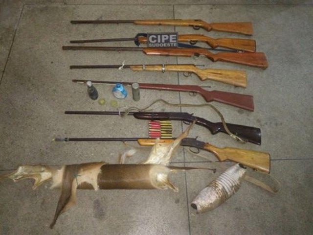 Na tarde de sábado (12), por volta das 17h30min, em rondas por uma estrada vicinal, no trecho que liga a cidade de Ituaçu, na Chapada Diamantina ao Povoado de Tranqueiras, uma guarnição Cipe Sudoeste recebeu a informação anônima de que em uma casa abandonada, as margens da estrada, teria um saco contendo alguns objetos ilicitos. De posse dessas informações, a guarnição deslocou-se até o local, onde foram encontradas várias armas tipo espingardas, outros materiais que são utilizados para recarregar cartuchos, bem como peles de animais silvestres. Foram apreendidas: 05 (cinco) espingardas chumbeiras de fabricação artesanal; 01 (uma) espingarda marca rossi de calibre 36 ; 01 (uma) espingarda marca rossi de calibre 32 ; 06 (seis) cartuchos recarregados de calibre 32; 08 (oito) estojos vazios calibre 32; 01(um) couro de veado já curtido; 01 (um) casco de tatu; 01 (um) frasco contendo pólvora; 02 (dois) frascos contendo chumbo e 01 (um) frasco contendo espoleta. Todo o material foi apresentado na delegacia de Brumado. (Foto: Divulgação – Polícia Militar).