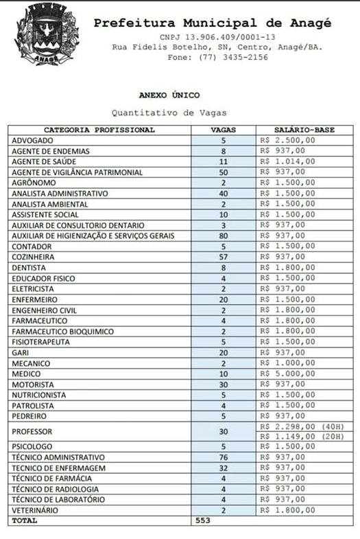 Localizada no Sudoeste Baiano a 51 quilômetros de Vitória da Conquista, Anagé vai promover um dos Concursos Públicos mais concorridos do Nordeste Brasileiro. O edital está em estágio de produção, mas uma a Lei Municipal Nº 402/2017, desta quinta-feira (21), expõe as 553 vagas disponíveis para diversos setores. Tem espaços para Advogado, Enfermeiro, Professor, Odontólogo, Nutricionista, Gari, Mecânico, entre outros. Os salários variam entre R$ 937 a R$ 5 mil. Confira a Lei Municipal Nº 402/2017.