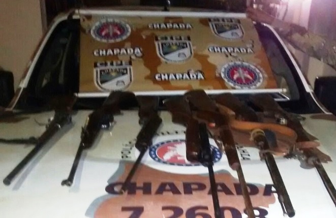 A informação de que a dupla estaria transportando armas chegou de forma anônima para os policiais da Cipe Chapada que de imediato montaram um bloqueio, na zona rural daquela cidade. No veículo foram localizados um rifle semiautomático, cinco espingardas de calibres diversos e farta munição.
