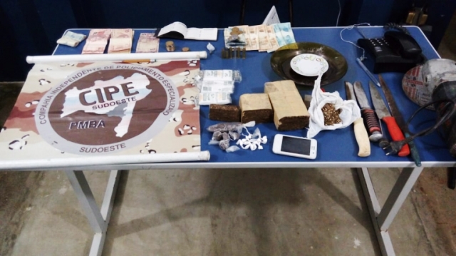Indagado pelos policiais sobre a origem das drogas, o mesmo disse que em sua residência tinha mais drogas, e ao chegar ao local foram encontrados uma certa quantidade em dinheiro, 2 tabletes de maconha, 6 munições, sendo 4 de calibre 357 e 2 de calibre 38, mais substâncias análogas a maconha misturada com sementes, lixadeira e facas. O acusado foi apresentado na delegacia de Livramento, onde foi lavrado o flagrante. (Vinny Publicidade com foto da Polícia Militar e informações de Nildo Freitas).