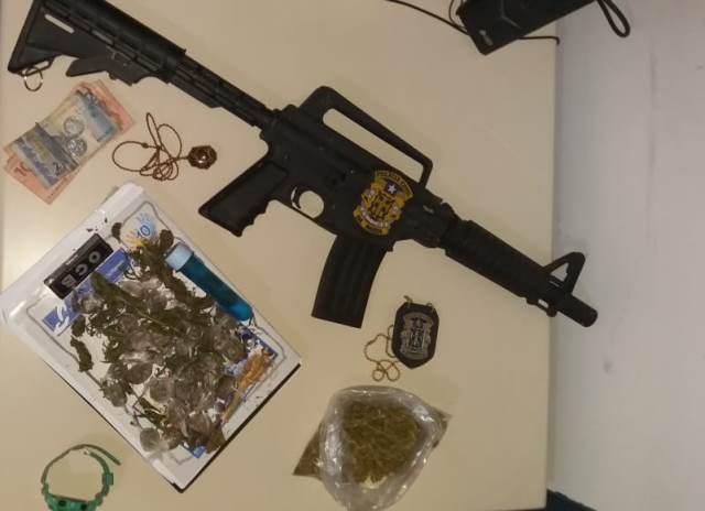 Por volta das 14h00, dessa quarta-feira (22), indivíduos foram conduzidos pelos Ipc’s Vinícius e Daniel após serem abordados com várias trouxinhas de maconha, e no decorrer das investigações, confessaram que estavam planejando juntamente com a pessoa de pronome Erick, assaltos em Seabra, na Chapada Diamantina, utilizando um fuzil, cuja foto foi encontrada no celular de um deles. A equipe de investigadores continuou efetuando diligências no sentido de encontrar o referido fuzil, e já no fim da tarde, Erick compareceu acompanhado de advogados entregando o mesmo, que trata-se na verdade de um simulacro de arma de fogo utilizado para “isoft”, muito similar a um fuzil autêntico. Segundo informações do DPC Marcelo Matos Aguiar ao Vinny Publicidade, a maconha e o simulacro foram retirados de circulação, e os traficantes foram autuados em flagrante. O referido artefato foi mandado para Seabra pelo preso de nome Djan, que encontra-se cumprindo pena em Salvador. Ha a suspeita de que o mesmo também manda drogas do presídio para que os referidos presos distribuam em Seabra e região. (Foto: Divulgação – Polícia Civil).