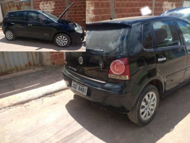 O veículo modelo Polo, que possui placa policial JSE 8481 adulterada e incompatível com o chassi, possui restrição de furto/roubo e foi apreendido. Diligências estão sendo realizadas na intenção de prender os meliantes. (Foto: Divulgação – Polícia Militar).