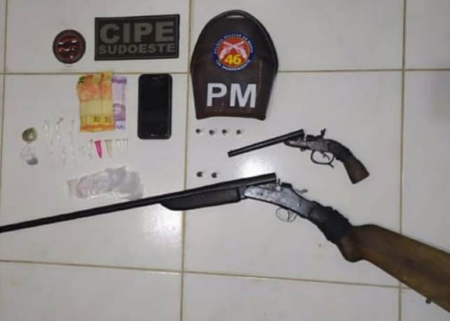 Por volta das 17h10min, de quinta-feira (16/01), quando em rondas pela cidade de Jussiape, região da Chapada Diamantina – BA, uma guarnição da Companhia Independente de Policiamento Especializado (Cipe) Sudoeste, juntamente com os policiais da 46ª CIPM receberam informações que na Fazenda Espinho, zona rural daquela cidade dois indivíduos possivelmente estavam portando arma de fogo, além de praticar tráfico de drogas na região. Ao chegar ao local os policiais avistaram dois indivíduos que ao perceberem a presença da viatura evadiram-se pelos fundos da propriedade. Um dos elementos foi contido pelos policiais e durante abordagem foi encontrado uma trouxinha de substância análoga a maconha. Indagado informou que havia outra quantidade em seu quarto, momento em que foram localizadas 17 (dezessete) petecas de sustância semelhante a cocaína e mais 04 (quatro) pinos vazios da mesma substância, 01 (uma) arma de fogo tipo garruncha, calibre .38, municiada com 02 (duas) munições do mesmo calibre. Em outro quarto do indivíduo foi encontrada uma espingarda com reforço para munição calibre .44 municiada com 01 (um) cartucho do mesmo calibre e mais dois de mesmo calibre .44. Foram encontradas ainda grande quantidade de sacos plásticos utilizados no acondicionamento e comercialização de entorpecentes, 01 (um) celular marca LG, a quantia de R$ 45,00 (quarenta e cinco reais) em espécie. Os indivíduos ao receberem voz de prisão resistiram à ordem legal sendo necessário o uso da força moderada com uso de algemas. Os mesmos foram conduzidos à DP de Brumado onde foram autuados em flagrante delito por tráfico de entorpecentes e posse ilegal de arma de fogo. (Vinny Publicidade com foto – divulgação – Cipe Sudoeste).