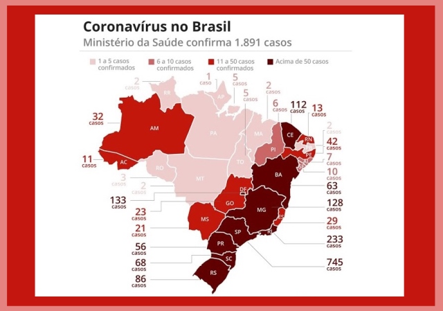 O total de casos confirmados de novo coronavírus (Sars-Cov-2) subiu para 1.891 nesta segunda-feira (23/03), segundo balanço do Ministério da Saúde. O número de mortes também aumentou para 34 mortes.