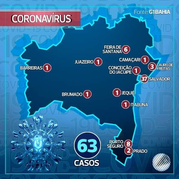 A Bahia totaliza 63 pacientes confirmados com coronavírus, 725 foram descartados e não há óbitos registrados. Todos os casos foram importados ou de transmissão local.