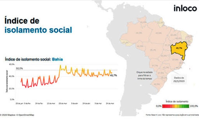 Dados da plataforma InLoco apontam que o índice de isolamento social na Bahia ficou em 45,7% na terça-feira (26/05), o quinto melhor do Brasil, atrás de dois estados da região Norte e dois do Nordeste. Já a capital baiana é a terceira melhor dentre todas do país, perdendo apenas para Macapá e Recife, respectivamente.
