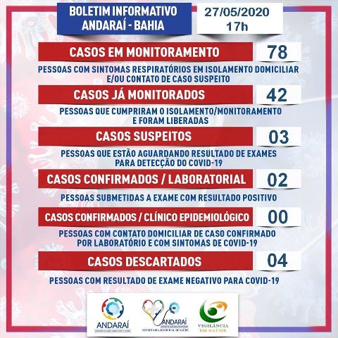 Mais um caso foi confirmado para infecção pelo Novo Coronavírus (Covid-19) em Andaraí, na Chapada Diamantina – BA, nesta quarta-feira (27/05), chegando a 02 pessoas contaminadas até o momento – de acordo com Boletim epidemiológico atualizado que foi divulgado pela Secretaria Municipal de Saúde.