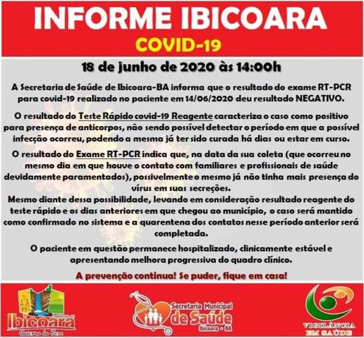 Um paciente de Ibicoara, região da Chapada Diamantina – BA, que apresentava situação suspeita, que teve resultado positivo pelo teste rápido para o Novo Coronavírus (Covid-19). De acordo com informações da Secretaria Municipal de Saúde, foi enviado o material coletado do paciente com o caso suspeito para um Laboratório, com o nome não divulgado. Os exames “RT-PCR” tiveram resultado negativo.