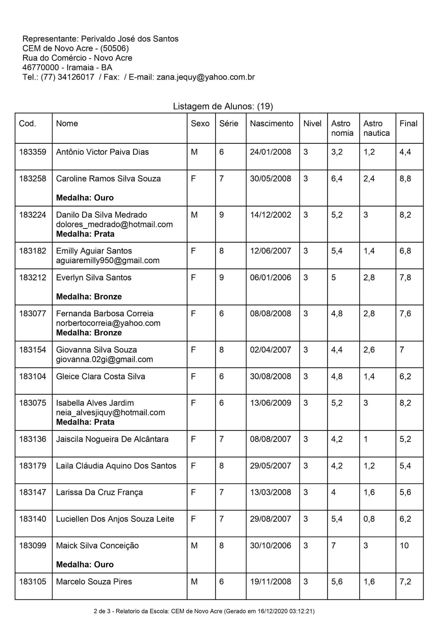 Nesta edição de 2020 que aconteceu de forma virtual no mês de novembro, a escola apresenta 06 estudantes medalhistas: Caroline Ramos Silva Souza e Maick da Silva Conceição com medalhas de ouro, Danilo da Silva Medrado e Isabella Alves Jardim com medalhas de prata, e Fernanda Barbosa Correia e Everlyn Silva Santos com medalhas de Bronze.