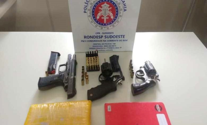 Na operação foi apreendido: Pistola Sarsilmaz ST10, cal. 9mm, 01 munição de cal. 9mm, revólver Taurus TSB sport -py cal.38. IP108626 (05 munições deflagradas + 03 munições intactas). revólver Taurus cal.38 de numeração suprimida (02 munições deflagradas + 03 munições picotadas), 25 munições cal.38 em uma caixa tipo colmeia, 01 tablete de substância análoga a cocaína e 01 caderno de anotações do tráfico. (Vinny Publicidade com foto – divulgação/Polícia Militar).
