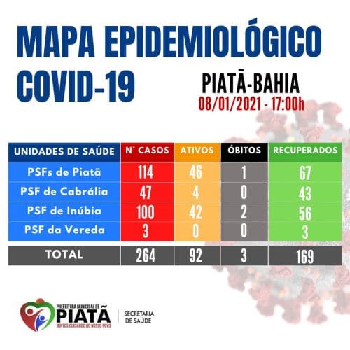 Deste modo, Piatã segue com 264 casos confirmados da Covid-19, 92 casos ativos, 03 óbitos e 169 recuperados da doença.