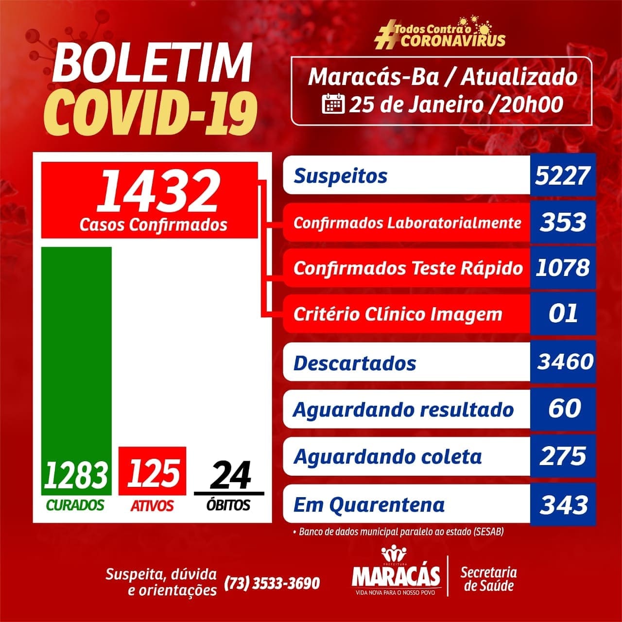Atualmente o boletim epidemiológico de Maracás, constam com 5.227 pacientes apresentaram sinais e sintomas de Síndrome Gripal e foram notificados para Covid-19 no município de Maracás – BA. Deste total, tivemos 1.432 casos confirmados: 1.078 casos por teste rápido e 353 casos pelo método RT-PCR em tempo real, destes, 1.283 pessoas já estão recuperadas da Covid-19 e desse montante de pessoas infectadas, foram registrados 24 óbitos.