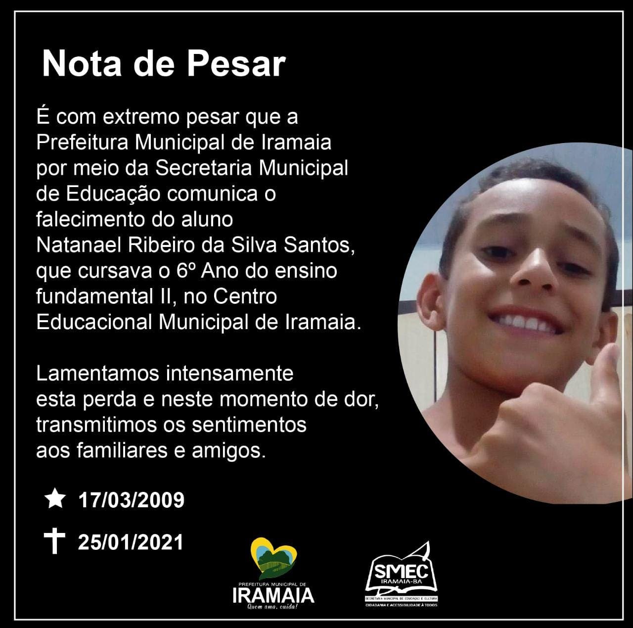 É com externo pesar que a Prefeitura Municipal de Iramaia, localizada na Chapada Diamantina – Ba, por meio da Secretaria Municipal de Educação, comunica o falecimento do aluno Natanael Ribeiro da Silva Santos, que cursava o 6º Ano do ensino fundamental II, no Centro Educacional Municipal de Iramaia.