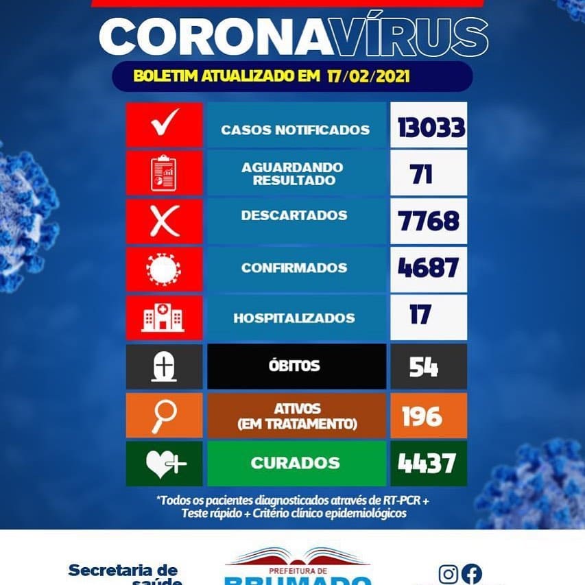 Na quarta-feira (17/02), Brumado, no Sudoeste da Bahia, registrou 4.687 casos confirmados da Covid-19, o Novo Coronavírus. São 13.033 notificações. Entre os diagnósticos: 17 internações, 54 óbitos, 196 pacientes em tratamento e 4.437 recuperados. No momento, 71 ainda aguardam resultado laboratorial e 7.768 já foram descartados. As notificações suspeitas abrangem pacientes com quadros de síndromes gripais diversas, dentre os quais alguns se encaixam nos critérios para realização do exame RT-PCR ou via teste rápido. Estes últimos estão sendo usados de forma criteriosa, em casos excepcionais, como estratégia para ampliar e tornar mais eficaz o enfrentamento à pandemia no município. (Foto: Vinícius Silva/Vinny Publicidade).