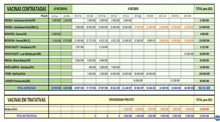 De acordo com o ministro, o governo federal já viabilizou a compra de vacinas de 10 fornecedores diferentes. Segundo os dados apresentados, o país contará com 562 milhões de doses até o final de 2021. Pazuello frisou, entretanto, que há chances de que nem todos os laboratórios cumpram os prazos estabelecidos.