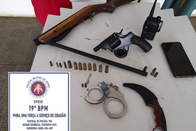 Com os criminosos foram encontrados um revólver calibre 44, uma carabina, 17 munições, uma algema, balança e um rádio comunicador. A ocorrência foi registrada na 9ª Coordenadoria Regional de Polícia do Interior (Coorpin/Jequié). (Vinny Publicidade com foto – divulgação/SSP-BA).