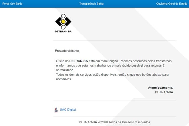 O Detran-BA esclarece que a retirada do site do ar não afeta os serviços de habilitação e veículos, que continuam funcionando normalmente, por meio de agendamento no www.sacdigital.ba.gov.br e aplicativo SAC Digital. (Vinny Publicidade com comunicado do Detran-BA).