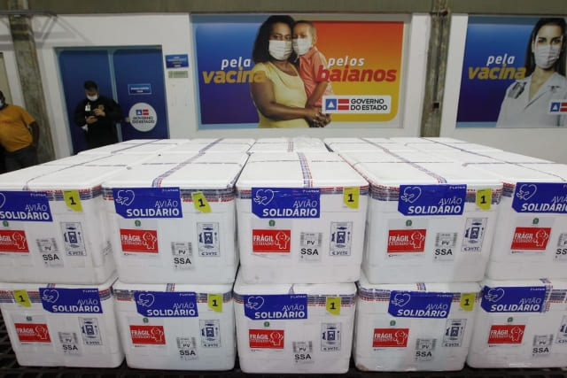 Uma nova remessa com 222.500 doses de vacinas contra a Covid-19 chegou à Bahia nesta quinta-feira (22). O avião que trouxe os imunizantes pousou no aeroporto de Salvador por volta das 17h. Do total, 180.500 foram produzidas pela Fiocruz/Astrazeneca/Oxford e 42.000 pelo Butantan/Sinovac. Com esta nova carga, a Bahia chega ao total de 3.893.450 doses de vacinas contra a Covid-19 recebidas.