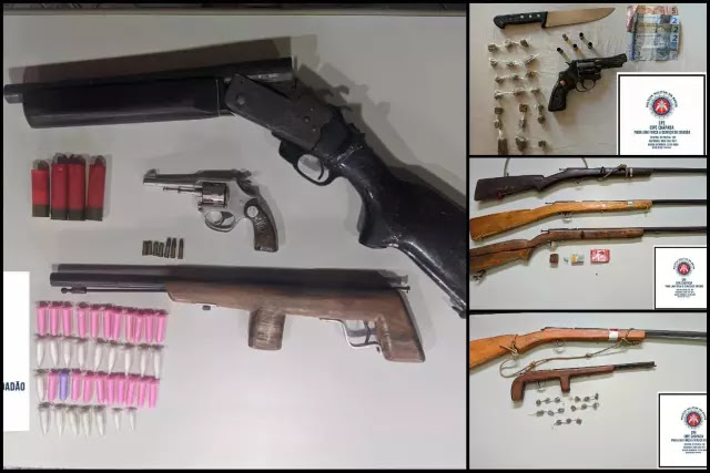 Segundo a Secretaria da Segurança do Estado da Bahia (SSP), a primeira ocorrência aconteceu no município de Itaetê (BA), por volta das 12h de domingo (02), que resultou na apreensão de duas espingardas e 15 trouxas de maconha. Os materiais estavam com um homem e foram encontrados durante diligências.