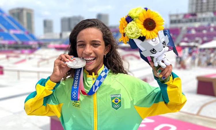 Brincando e se divertindo, Rayssa Leal fez história nos Jogos Olímpicos Tóquio 2020. Na estreia do skate na competição mais importante do esporte mundial, a brasileira de apenas 13 anos conquistou a medalha de prata e se tornou a mais jovem atleta do Brasil, entre homens e mulheres, a subir ao pódio na história olímpica. “Não caiu a ficha ainda. Poder representar o Brasil e ser uma das mais novas a ganhar uma medalha. Eu estou muito feliz, esse dia vai ser marcado na história. Eu tento ao máximo me divertir porque eu tenho certeza de se divertindo as coisas fluem, deixa acontecer naturalmente, se divertindo”, afirmou o atleta, que cativou o público brincando, dançando, aplaudindo as manobras das adversárias e se divertindo enquanto competia contra as melhores do mundo na final em Tóquio. O Brasil classificou três atletas para a primeira final do skate olímpico. Pâmela Rosa foi a se apresentar, na terceira bateria. Ela somou 10.06 pontos e, por ter errado três de cinco manobras, acabou ficando fora da final. Terminou em décimo lugar. Depois foi a vez de Letícia Bufoni e Rayssa Leal entrarem na pista, na quarta e última bateria. Letícia marcou 10.91, mas terminou na nona colocação. Na disputa que decidiu a medalha, Rayssa atingiu 14,64 e foi superada apenas pela japonesa Nishiya Momiji, com 15s26. Outra atleta da casa, Funa Nakayama fez 14,49 e ficou com o bronze. (Vinny Publicidade com foto – reprodução/Julio Detefon (CBSk).