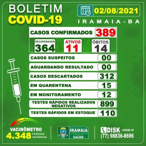 A Secretaria Municipal de Saúde de Iramaia, localizada na Chapada Diamantina (BA), emite nota de pesar e informa nesta segunda-feira (02/08), que ocorreu mais 1 (um) óbito por Covid-19 e suas complicações.