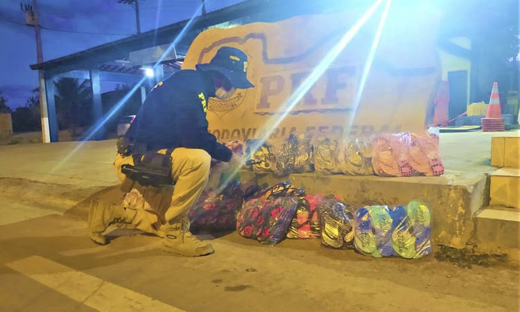 Uma carga de calçados falsificados e sem nota fiscal foi apreendida pela Polícia Rodoviária Federal (PRF) nesta sexta-feira (13), em Seabra, na Chapada Diamantina (BA). O carregamento foi apreendido durante fiscalização a um ônibus de viagem no km 408 da BR-242. No compartimento de carga do ônibus foram encontrados aproximadamente 321 pares de chinelos estampados com a marca Havaianas, porém, com sinais claros de falsificação. Também foram achadas 21 pares com a marca Mikalce e 24 com a marca Kazzir.