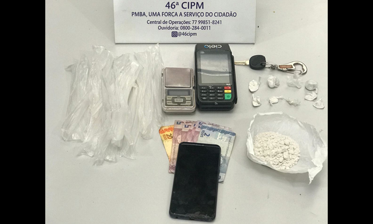 A 46ª Companhia Independente de Polícia Militar (CIPM), informou ao site Vinny Publicidade, que foi apreendido: 01 porção com 40g de substância análoga à cocaína; 07 trouxinhas de substância análoga à cocaína; 01 balança de precisão; 01 máquina de cartão de crédito; embalagens para acondicionamento da droga; R$ 47,00 em espécie; 01 celular da marca Asus e 01 veículo WS Gol branco.