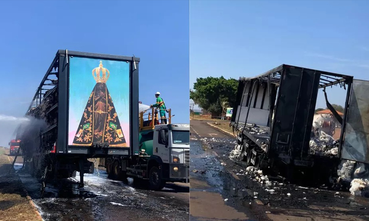 Um caminhão que carregava fardos de algodão pegou fogo enquanto trafegava pela rodovia federal 267, em Bataguassu (MS), na manhã desta quinta-feira (28). Apesar das chamas, o que chamou a atenção no incêndio foi um painel de Nossa Senhora Aparecida que ficou intacto depois de todo o estrago no veículo. De acordo com o Corpo de Bombeiros, o motorista não ficou ferido. Foram utilizados mais de 500 mil litros de água para conter as chamas. Além dos Bombeiros, diversos caminhões pipas de empresas da região auxiliaram no combate às chamas. O cavalo mecânico, composto pela cabine, rodas e motor do veículo, que estavam diante do painel de Nossa Senhora, também não foi afetado. O motivo do acidente ainda não foi identificado e, segundo informações dos Bombeiros, o trânsito no local ficou lento por várias horas, mas já foi normalizado. Essa não é a primeira vez que a Mãe Aparecida se “salva” em um incêndio. Em janeiro, no Paraná, uma imagem da Padroeira do Brasil também ficou intacta após as chamas destruírem um caminhão.