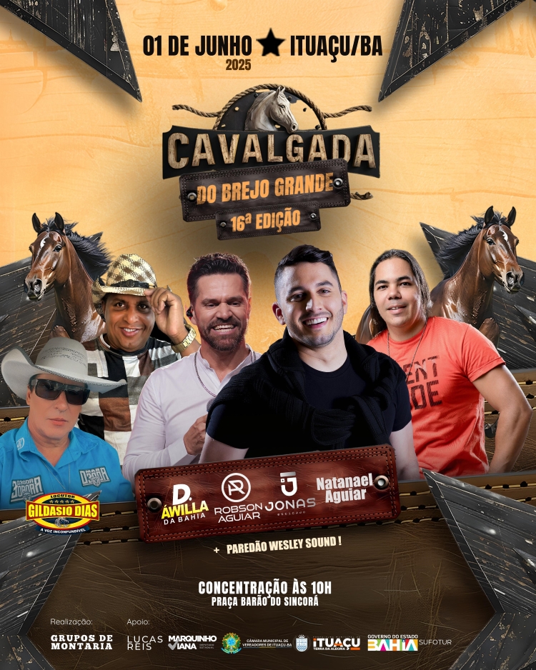 No próximo dia 1º de junho, será realizada a 16ª Cavalgada do Brejo Grande, em Ituaçu, na Chapada Diamantina. A concentração será na Praça Barão do Sincorá, ao som contagiante de D’Avilla da Bahia. Em seguida, cavaleiros e amazonas seguirão pelo melhor trajeto da região, embalados pelo Paredão de Wesley Sound e pela animada locução de Gildásio Dias.