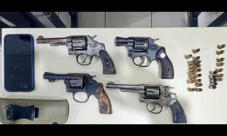 Material apreendido: 03 revólveres calibre 32, sem marca aparente; 01 revólver calibre 22, marca Rossi; 17 munições calibre 9mm; 12 munições calibre 380; 01 munição calibre 38 TPC e 01 aparelho celular.