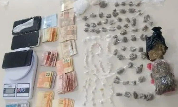 Durante a ação, os policiais apreenderam: 58 buchas de substância análoga à maconha, 02 pedaços grandes de substância análoga à maconha, 05 buchas de substância análoga à cocaína, 01 pedaço grande de substância análoga à cocaína, 64 pedras de substância análoga ao crack, 01 pedaço grande de substância análoga ao crack, 04 aparelhos celulares, 02 balanças de precisão e R$ 1.315,00 em espécie.