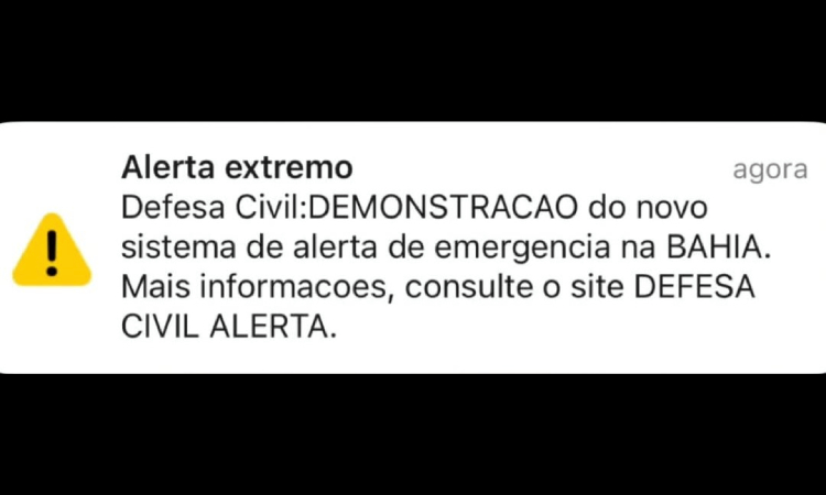 Alerta extremo. Defesa Civil: Demonstração do novo sistema de alerta de emergência na Bahia. Mais informações, consulte o site Defesa Civil Alerta.”