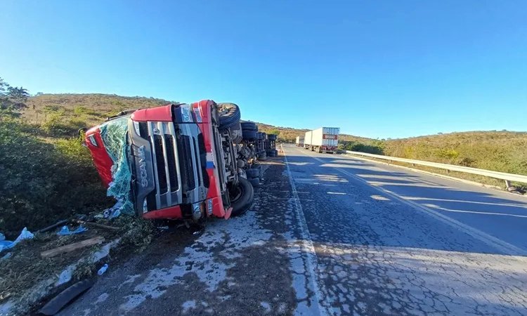 Um grave acidente foi registrado na madrugada desta sexta-feira (20), no km 747 da BR-116, no trecho que passa pelo município de Poções, no Sudoeste da Bahia. De acordo com informações da Polícia Rodoviária Federal (PRF), uma carreta tombou após o motorista perder o controle da direção em uma curva.