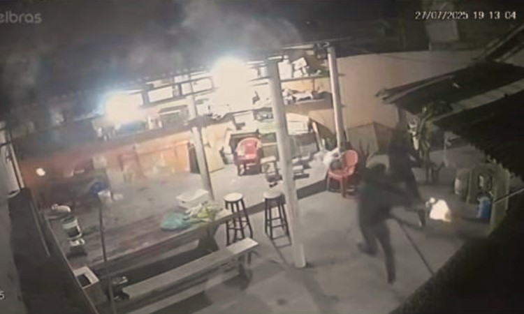 Câmeras de segurança do estabelecimento registraram o momento em que dois suspeitos chegaram ao local e ordenaram que os frequentadores saíssem. Durante a ação, um dos indivíduos colidiu com uma estrutura do bar e acabou deixando cair um boné, que pode auxiliar nas investigações.
