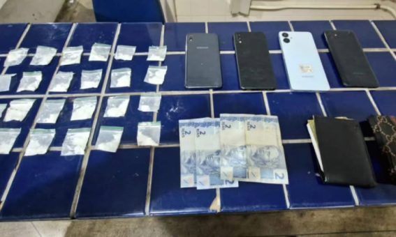De acordo com a Polícia Militar, foram apreendidos: 21 papelotes de cocaína (totalizando 21g); 2 saquinhos plásticos para acondicionamento; 4 aparelhos celulares (marca Samsung); R$ 8,00 em espécie; 2 carteiras e 3 cartões de crédito.