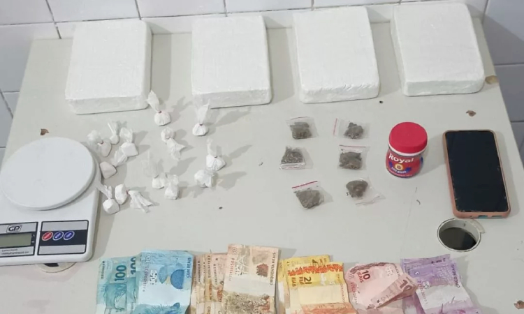 Na abordagem, foram encontradas com ele, porções de drogas. Em buscas pelo perímetro, foi localizada uma mochila contendo quatro tabletes de cocaína e 13 porções da mesma substância, seis porções de maconha, uma balança digital, um celular e dinheiro em espécie.