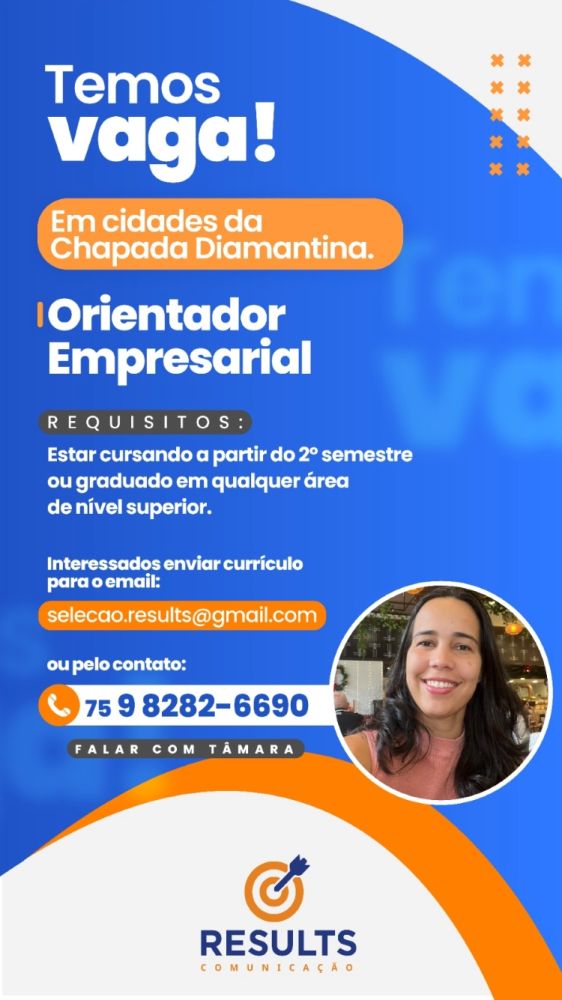 A empresa Results Comunicação abriu processo seletivo para a função de Orientador Empresarial em cidades da Chapada Diamantina.