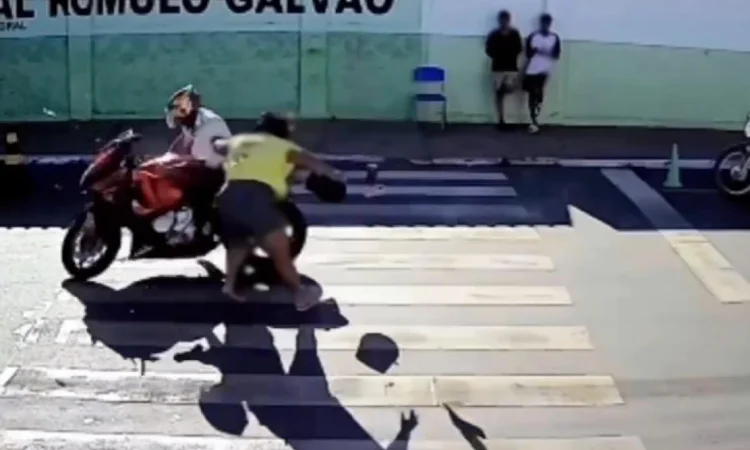 Uma mulher foi atropelada por uma motocicleta na tarde desta terça-feira (8), enquanto atravessava a faixa de pedestres em frente à Escola Municipal Rômulo Galvão, no centro de Livramento de Nossa Senhora, na Chapada Diamantina. O acidente ocorreu por volta das 15h43 e foi registrado por uma câmera de segurança instalada nas proximidades.