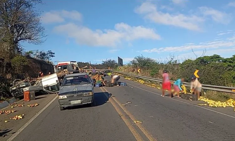 Ambos foram socorridos por uma equipe do Serviço de Atendimento Móvel de Urgência (SAMU) e encaminhados ao hospital. O caminhão ficou atravessado na pista e a carga se espalhou pela rodovia, mas a remoção já foi concluída no local.
