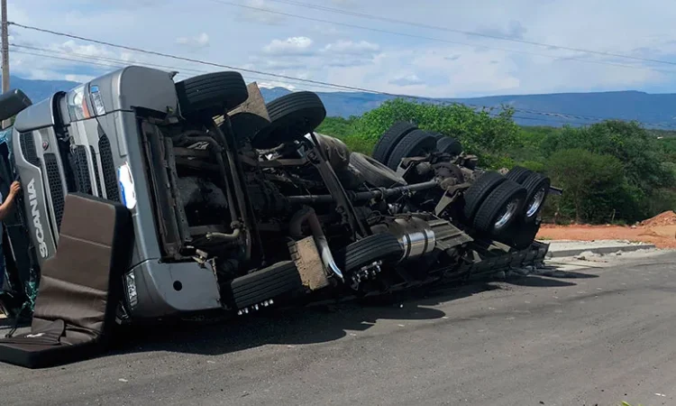 Um caminhão que transportava argamassa tombou na tarde desta quinta-feira (20) na Avenida Prefeito Zezito Caires, em Dom Basílio, no Sudoeste da Bahia. O acidente ocorreu por volta das 13h50, logo após o veículo contornar uma curva. Segundo testemunhas, o motorista perdeu o controle da direção, fazendo com que o caminhão virasse na lateral da pista.