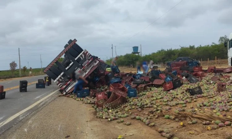 Um caminhoneiro ficou ferido após perder o controle de um veículo carregado com mangas, na madrugada deste domingo (23), em um trecho da BR-030, próximo ao acesso ao distrito de Pajeú dos Ventos, em Caetité, no Sudoeste da Bahia.