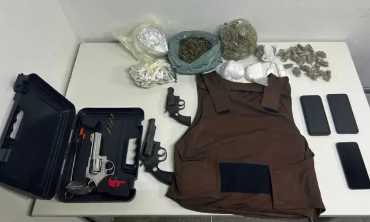 Durante a operação, foram apreendidos três revólveres, munições de diversos calibres, 760g de maconha, 262g de cocaína, celulares, um colete balístico e uma motocicleta Honda CG/150 com sinais de furto.