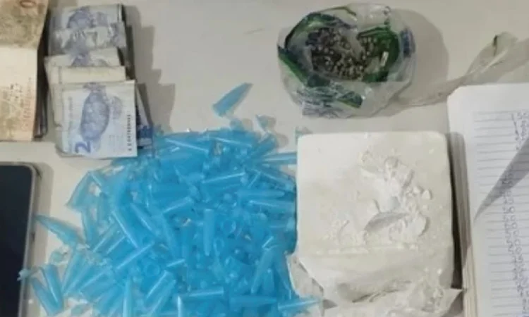 No entorno do estabelecimento, a guarnição localizou vários pinos contendo substância análoga à cocaína, além de uma mochila com um tablete da mesma substância, outras porções fracionadas, embalagens para acondicionamento da droga, três balanças de precisão, uma faca, uma munição calibre .40 da marca CBC, três aparelhos celulares e uma quantia em dinheiro.