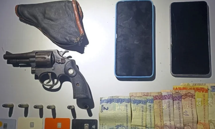 Durante a revista, os policiais encontraram um revólver calibre .32, da marca Taurus, com cinco cartuchos intactos e um deflagrado. O condutor do veículo e a acompanhante foram detidos.