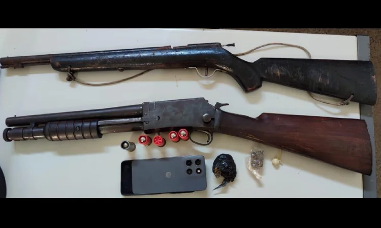 Segundo a corporação, as equipes realizavam rondas na região quando localizaram os suspeitos em posse do material ilícito. Durante a abordagem, foram apreendidas uma espingarda calibre 12, um rifle calibre .22, duas espingardas de fabricação artesanal, além de cinco estojos intactos de calibre 12, um aparelho celular Motorola e três porções de maconha.