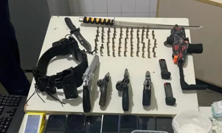 Entre os itens recolhidos estão uma pistola Taurus calibre .40, dois revólveres calibre .38 — sendo um com numeração suprimida —, carregadores, munições, simulacros de armas de fogo, além de 933 pinos de cocaína, recipientes contendo cocaína e maconha, R$ 9.144 em dinheiro, balança de precisão, celulares, máquinas de cartão e equipamentos táticos.